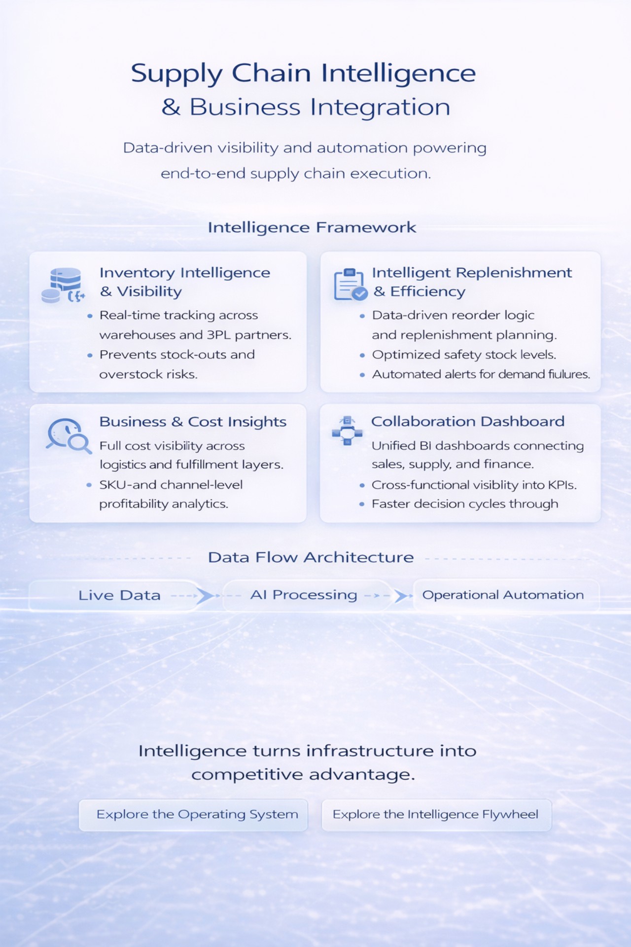 From upstream sourcing to last-mile delivery, Kyber integrates planning, procurement, warehousing, and fulfillment into a single operational framework.